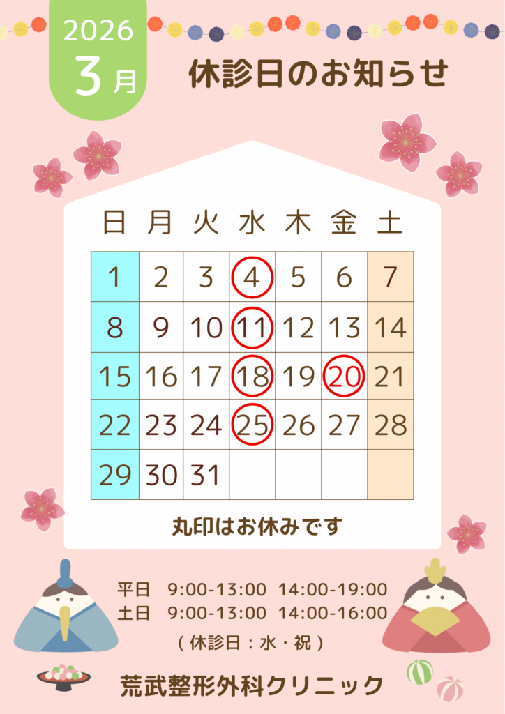 3月の休診日のご案内 2026.02.01 休診 寒い日が続いていますね。 この時期は体が冷えて、腰や膝、肩の痛みが出やすくなります。 気になる症状がありましたら、お気軽にご相談ください。 2月23日(祝)休日当番医のお知らせ 前の記事